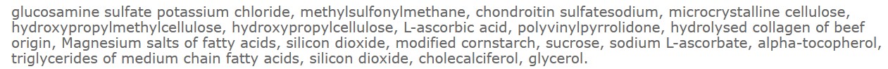 Kombinácia glukozamín sulfátu, chondroitín sulfátu, MSM (OptiMSM®), kolagénu (Peptan®), vitamínu D3 a vitamínu C pomáha obnoviť pružnosť chrupaviek, udržiavať správnu hydratáciu tkanív a podporovať pohyblivosť.