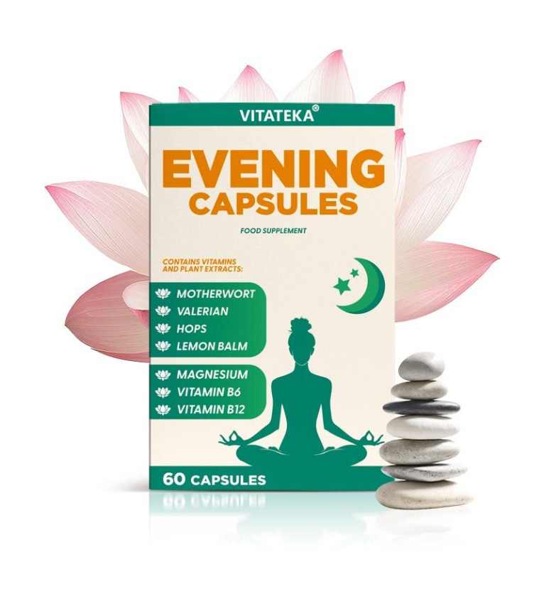 Večerný relax komplex – Vitateka je doplnok stravy vo forme kapsúl určený na užívanie vo večerných hodinách. Obsahuje kombináciu horčíka, vitamínov skupiny B, aminokyselín a rastlinných extraktov, ktoré podporujú relaxáciu a psychickú pohodu.