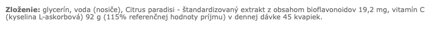 Citrus paradisi, extrakt z jadier a dužiny grapefruitu, obsahuje komplex biologicky aktívnych flavonoidov. Vitamín C prispieva k normálnej funkcii imunitného systému a k ochrane buniek pred oxidačným stresom. Podieľa sa tiež na regeneráciu redukovanej formy vitamínu E, zvyšuje vstrebávanie železa. Prípravok je možné vhodne využiť k ochrane organizmu doma aj na cestách do rizikových krajín. Citrus paradisi obsahuje 84% extrakt z jadier a dužiny grapefruitu, ktorý je štandardizovaný na obsah účinných bioflavonoidov 800 mg / 100 ml.