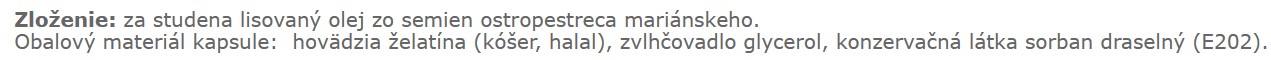 100% olej zo semien ostropestreca mariánskeho obsahuje 2,43% silymarínu (1 kapsula 270 mg x 2,43% = 6,6 mg)
